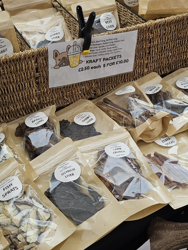 Rabbit lung, Rabbit liver, Lamb Crunch, lamb Tails, Beef lung, Beef liver, Turkey liver, Ostrich liver, Chicken Jerky, Broken sausages ( contain chicken), Fish Sprats, Fish cubes, Sweet potato, mini Trachea curls, Chicken Hearts. Beef abomasum, Beef testicle, Braided Gullet
